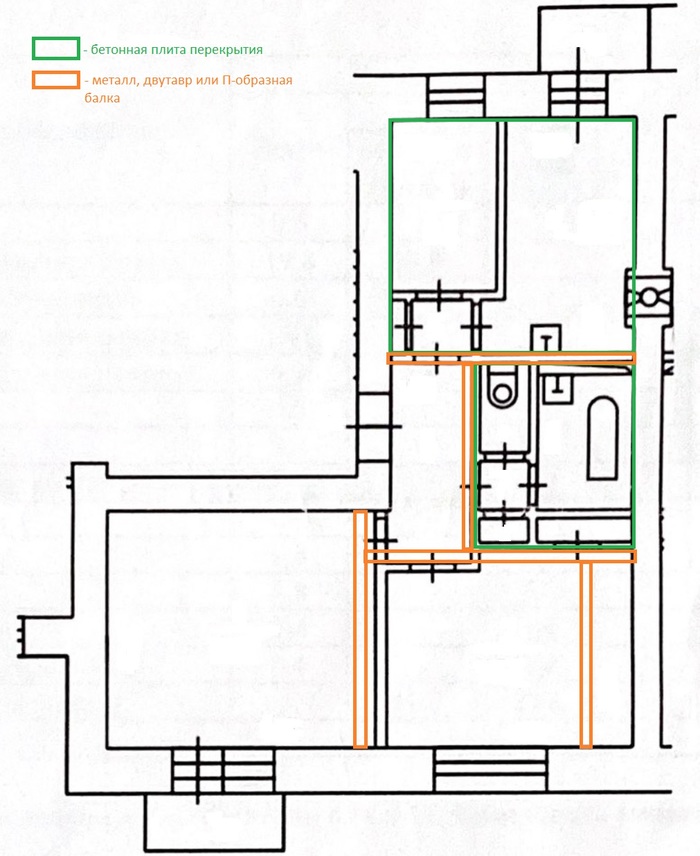 Зелёный — это бетонная плита или стяжка. Да, на кухне точно плита, так как квадратная. А вот ванная комната чистой воды стяжка, так как торчит местами дерево и куски чего-то похожего на асфальт. Оранжевый – металл (двутавровая или П-образная балка).