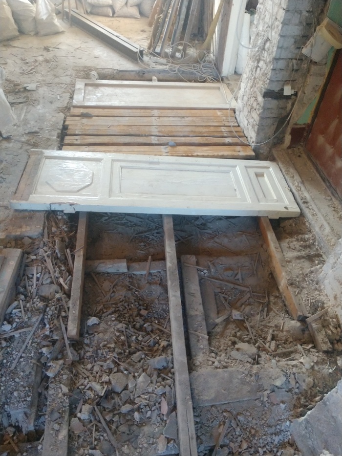 Как-то вот так лежал чистовой пол. На его лагах лежит дверь. Лаги закреплены только по краям