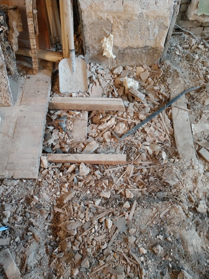 Так как до соседей сверху достучаться не получилось, то решили дранку не открывать с потолка, дабы случайно не оторвать доски чернового пола/потолка и не получить себе на голову несколько килограмм мусора. Сомневаюсь, что его выгребали.