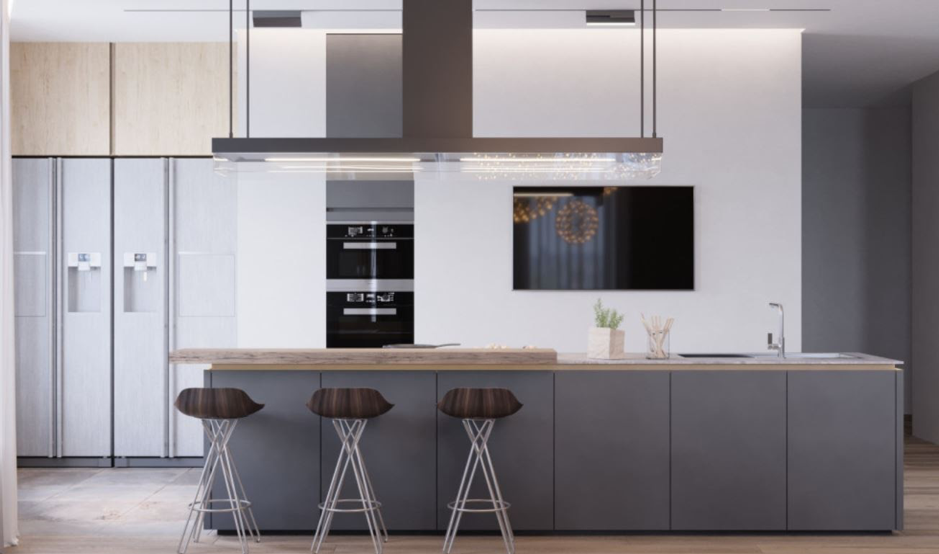 Основная цветовая гамма — холодная и часто монохромная, но при этом допускается броский акцент. Вместо декора и текстиля в качестве аксессуаров может выступать бытовая техника, различные металлические фактуры, интересная диодная подсветка.