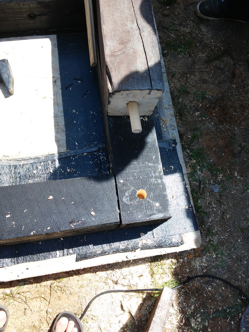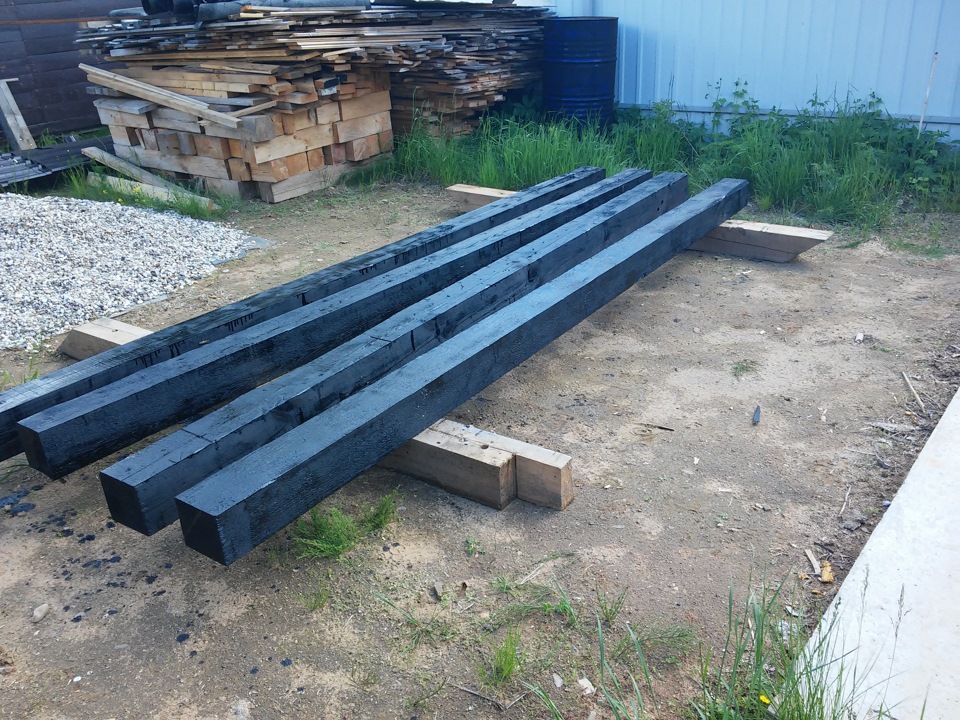 В первую очередь делаем раму-основание для беседки. Ее я делал в одно лицо — удовольствие еще то. За два дня выходных успеть все размерить, напилить и прокрасить (использовал кузбасс лак). Хорошо что это были бывшие половые лаги из сгоревшего дома… ну как хорошо, хорошо что они уже были пропитаны в два слоя, плохо что в них остались обломанные саморезы. пару раз бензопила осталась недовольна