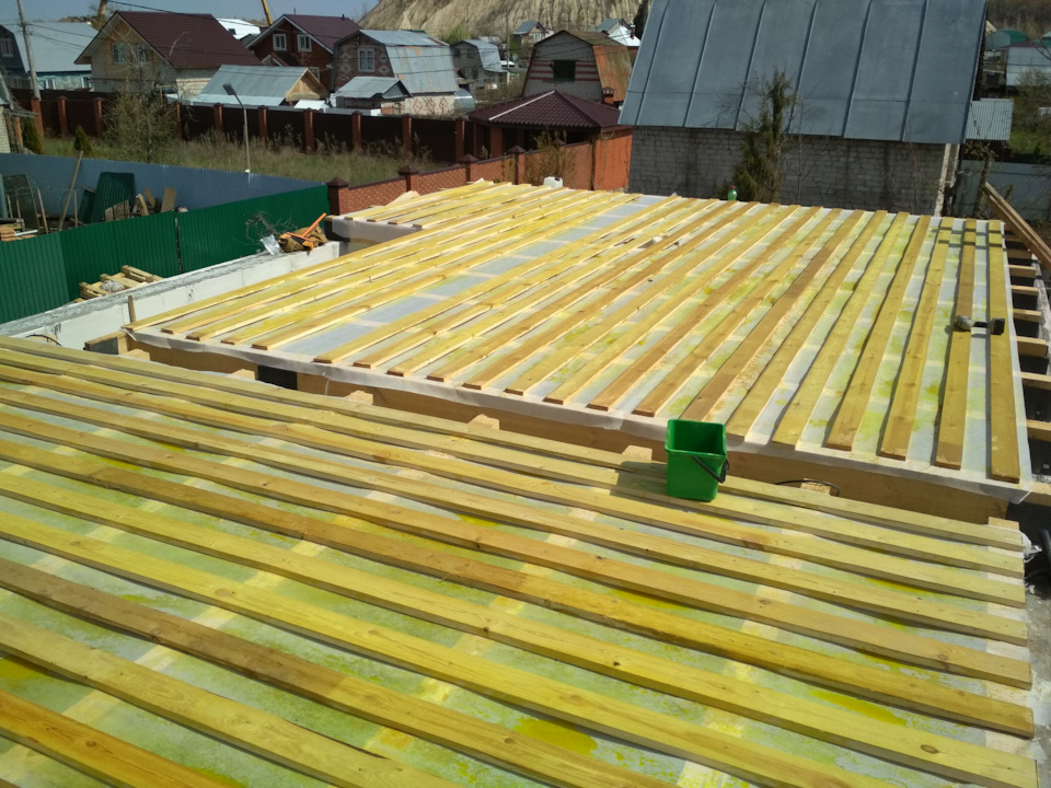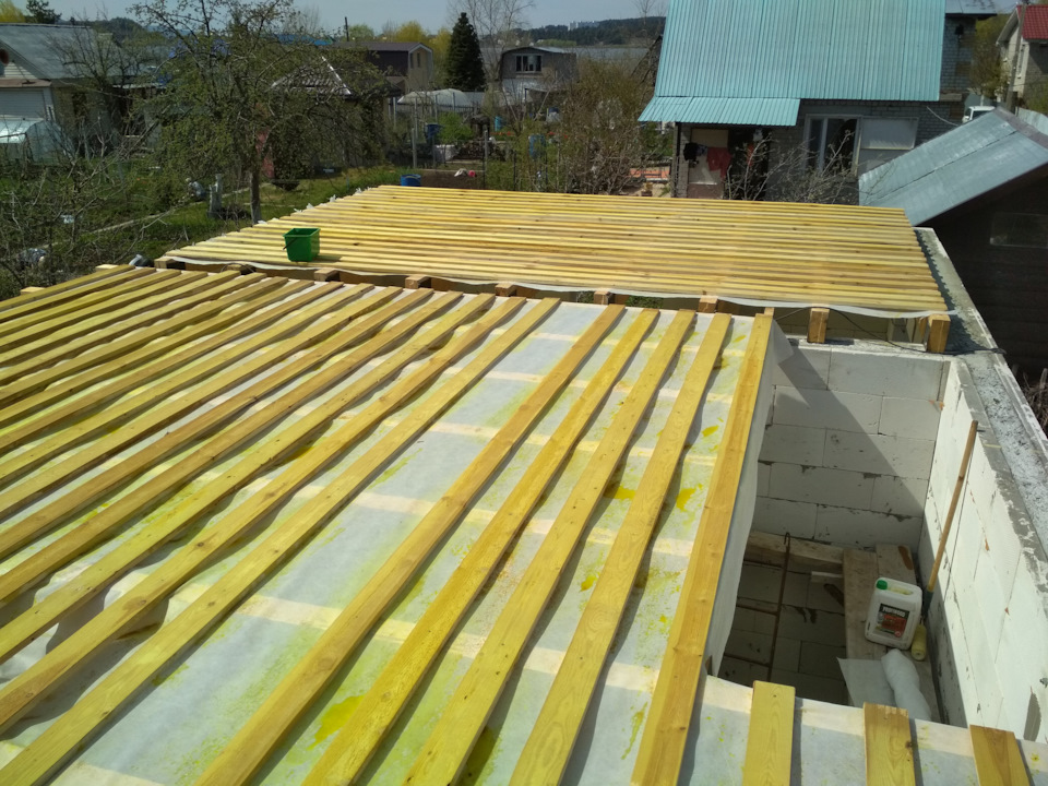Поверх балок была разложена гидроизоляция, а потом закреплена обрешетка. Обрешетку так же обработал антисептиком.