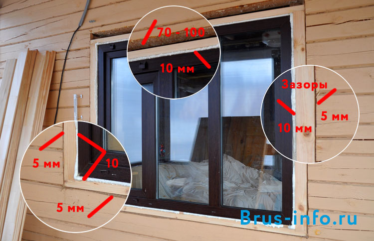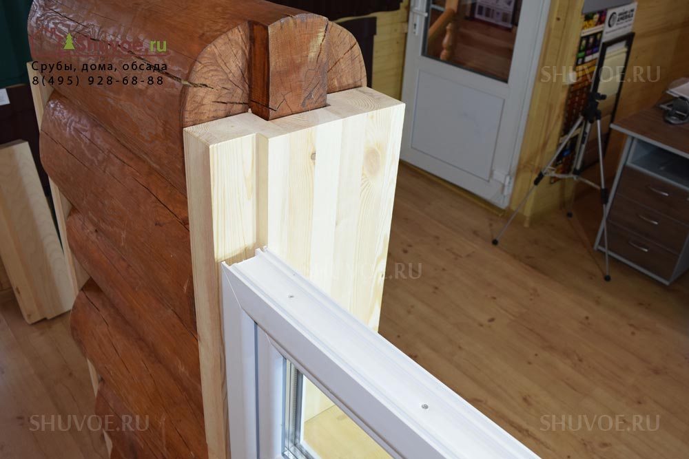 Правильная установка пластикового окна в деревянном доме — окно вставлено в короб из бруса, который скользит в проеме и не мешает усадке дома.